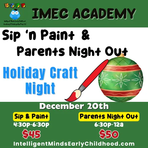 Celebrate the holidays at our Sip & Paint + Parents Night Out Craft Night! Kids will create festive crafts, enjoy our cozy hot cocoa bar, play fun holiday games, and more. A perfect evening of creativity and cheer while parents enjoy a night off!